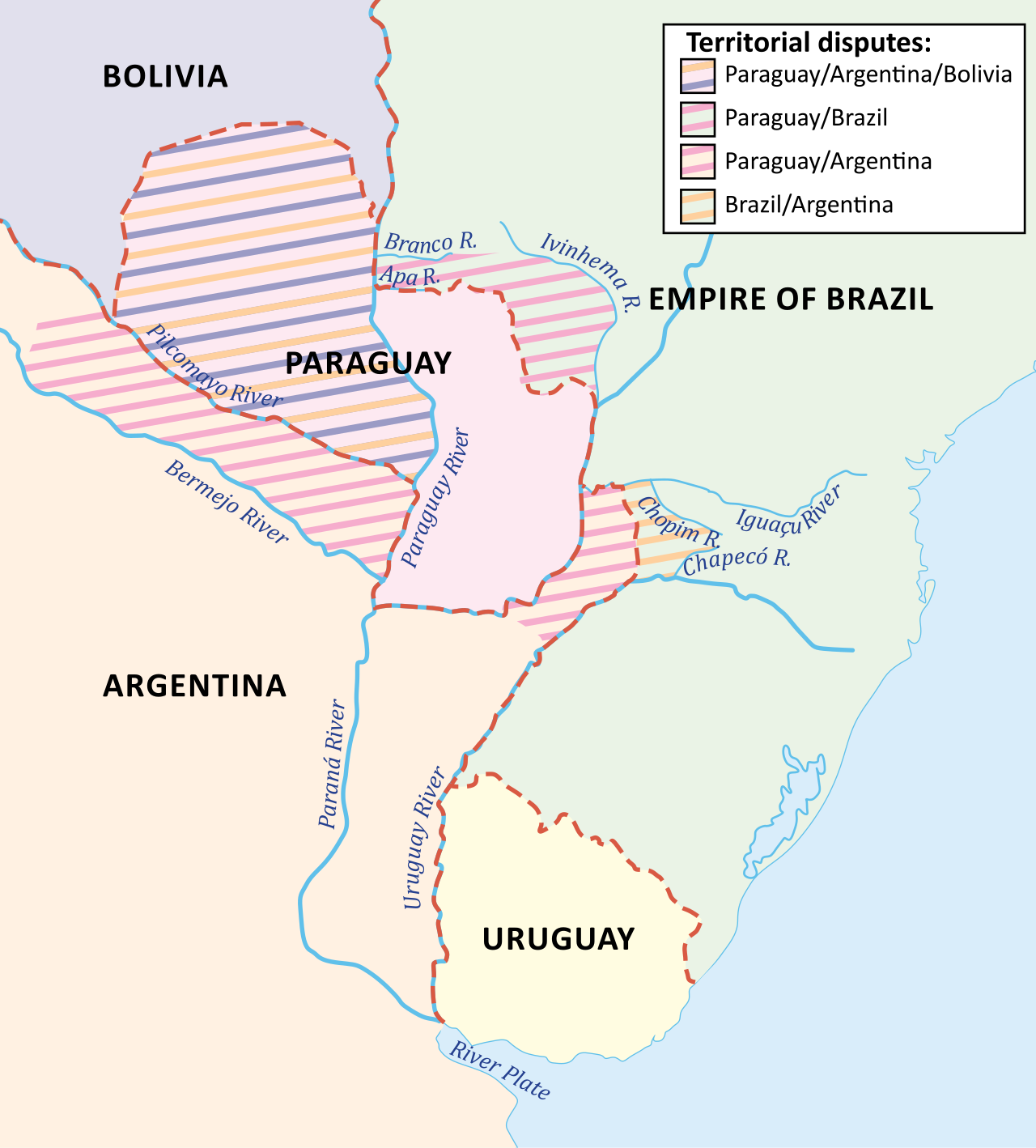 Territorial disputes in the Platine Region in 1864. Based on File:Territorial disputes in the Platine region in 1864.png. Source: Magnoli, Demétrio (2009) (in Portuguese). História das guerras (4th ed.). São Paulo: Contexto. ISBN 978-85-7244-346-3 (chapter "Guerra do Paraguai", p.259); Viana, Hélio (1994) (in Portuguese). História do Brasil: período colonial, monarquia e república (15th ed.). São Paulo: Melhoramentos. ISBN 978-85-06-01999-3 (chapters LXV "Guerra do Paraguai" and LXXI "Política exterior da República", pp.538, 576)